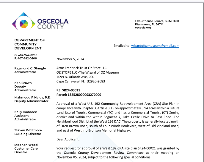 Plan Approved (Nov 2024): Currently has a plan-approved Civic Site by Osceola County for a 15,500 SF building plus parking.